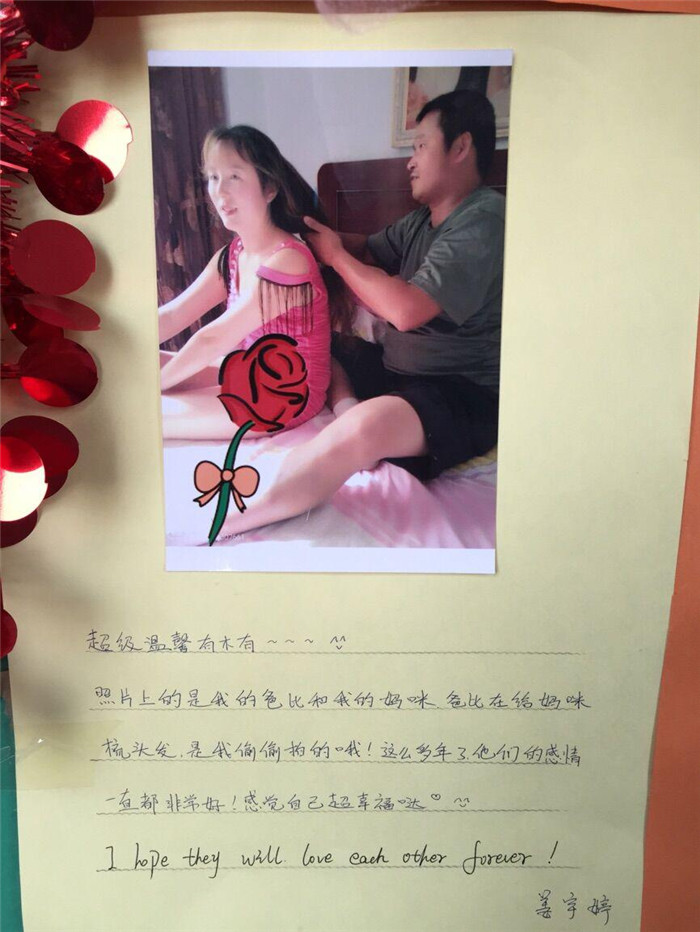 姜宇婷同學的美文配圖,展示了她和睦的家庭,父親為母親梳頭的畫面,讓每一個看到照片的人們,都能感受到濃濃的幸福感;王修文同學的《霧霾下的我們》一文,關注空氣污染,主動學習保護環(huán)境的方法;孫玲、申小玲、李佳等同學的小制作,雖然簡單卻極富有個性。