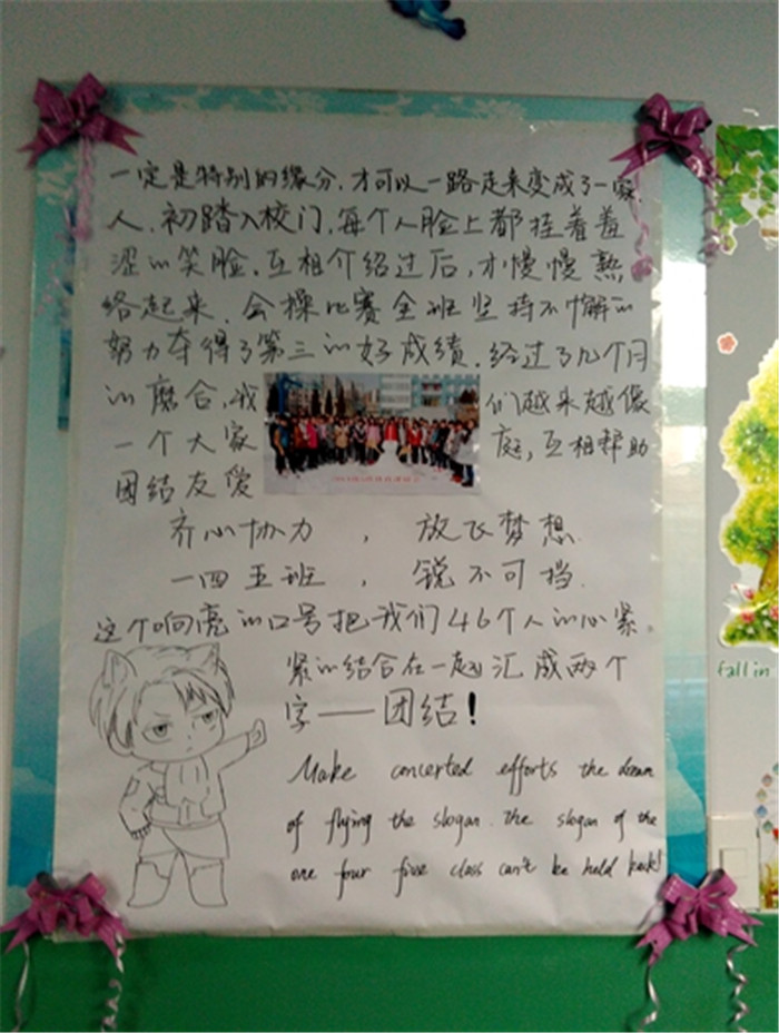 為了突出班級特色,增強班集體的凝聚力,營造和諧的班風,2014級5班以“攜手共進,積極進取”為主題開展了班級文化展評活動。