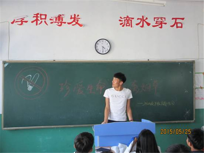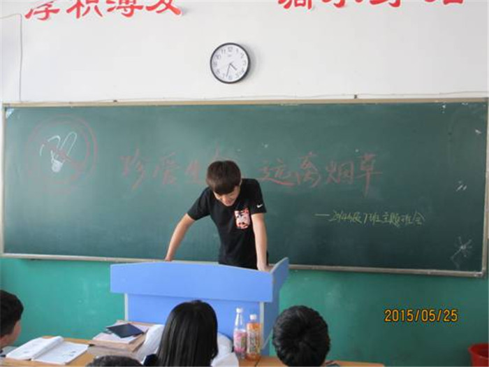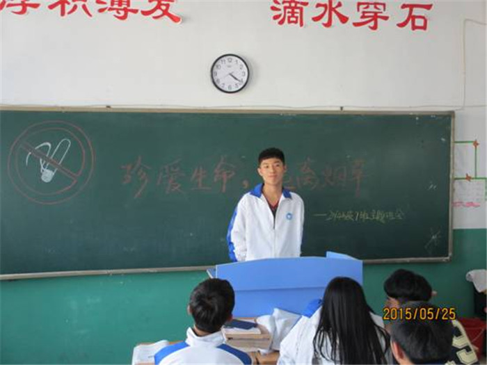 最后,班級幾位男同學走上講臺進行了發(fā)言,這些都是平時有過嚴重抽煙行為的學生。其中第一個發(fā)言的周明甲同學還因此受到了學生處的全校通報批評處分。通過這次活動,幾位同學都受到了不同程度的教育,也都在全班同學面前承認了錯誤表明了決心,并自覺接受全班同學和老師的監(jiān)督,爭取早日改掉抽煙的壞習慣。