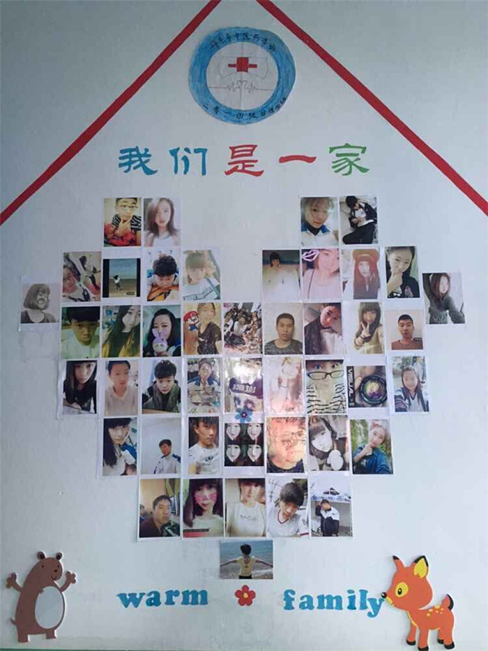 更有創(chuàng)意的是學生們精心設計的照片墻,由44張照片拼成心形圖案,44顆心連在一起,44名同學在一個溫馨的家庭里,房間里有我們精心設計的班徽。我們是一家!