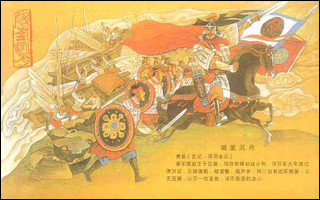 巨鹿之戰(zhàn),楚霸王項(xiàng)羽破釜沉舟,公元前208年,趙王歇被秦軍將領(lǐng)王離率領(lǐng)20萬大軍圍困在巨鹿,無奈之下派使者向楚懷王求援。當(dāng)時(shí)秦軍十分強(qiáng)大,沒有人敢前去迎戰(zhàn)。項(xiàng)羽為報(bào)秦軍殺父之仇主動(dòng)請纓,于是楚懷王便封項(xiàng)羽為上將軍,率軍五萬以解巨鹿之困。項(xiàng)羽先派遣部將英布、蒲將軍率領(lǐng)兩萬人為先鋒,渡過漳河,切斷秦軍運(yùn)糧通道。然后,項(xiàng)羽親率全部主力渡河,并下令全軍將士破釜沉舟,每人只攜帶三天的干糧,以示決一死戰(zhàn)之決心。項(xiàng)羽對將士們說:“我們這次出兵巨鹿,有進(jìn)無退,三天之內(nèi),一定要打敗秦軍。”項(xiàng)羽破釜沉舟的決心和勇氣,極大地鼓舞了將士們的士氣。楚軍個(gè)個(gè)士氣振奮,以一當(dāng)十,奮勇死戰(zhàn),九戰(zhàn)九捷,大敗秦軍。此時(shí),齊、燕等各路援軍也沖出營壘助戰(zhàn),最后俘獲了秦軍統(tǒng)帥王離,殺了其副將,巨鹿之困因而得解。