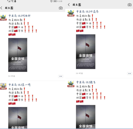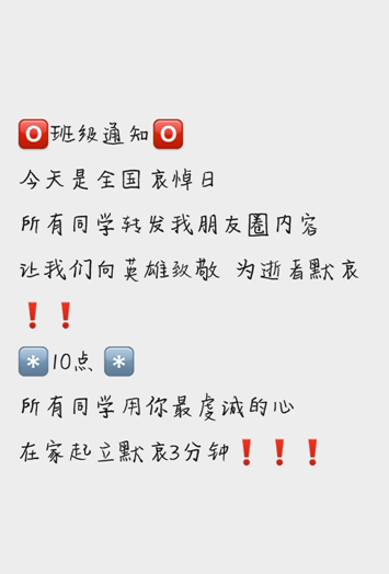 我打開朋友圈,全部都是統(tǒng)一的文案向英雄致敬,向逝者默哀,中國加油,祖國萬歲,我也發(fā)了一個一樣的。每條朋友圈都是每個人對英雄的敬仰。